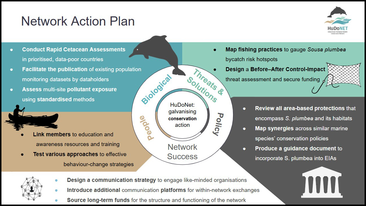 By focusing on coordination, knowledge sharing and targeted action, HuDoNet aims to reduce duplication, amplify existing efforts and support more consistent consideration of humpback dolphins in research agendas and management decisions across their range. The Network Action Plan is intended to be a living document that will guide HuDoNet’s activities over the next few years and support closer collaboration with regional initiatives such as the Arabian Sea Whale Network, where shared challenges and complementary mandates create strong opportunities for synergy.